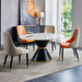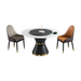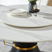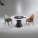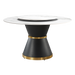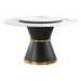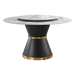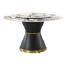 Make a striking impression with the Sintered Stone Dining Table ND615. Its matte sintered stone tabletop and base panel offer durable elegance, while the matte black carbon steel legs are accentuated by a titanium-finished stainless steel gold ring, adding a daring touch of modern sophistication to your dining space.