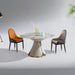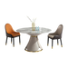 The Sintered Stone Dining Table ND670 boasts a matte sintered stone tabletop with a solid base panel, delivering understated sophistication. Its titanium-finished stainless steel leg frame wrapped in leather veneer adds a daring fusion of modern strength and refined texture, making it a striking centerpiece for any stylish dining space.